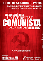 Des d'Endavant Girona us convidem a participar en l'acte de presentació de la Universitat Comunista dels Països Catalans, que tindrà lloc a Girona el dijous 11 de desembre a dos quarts de vuit del vespre, al Casal Independentista El Forn (c/. del Carme, 207).